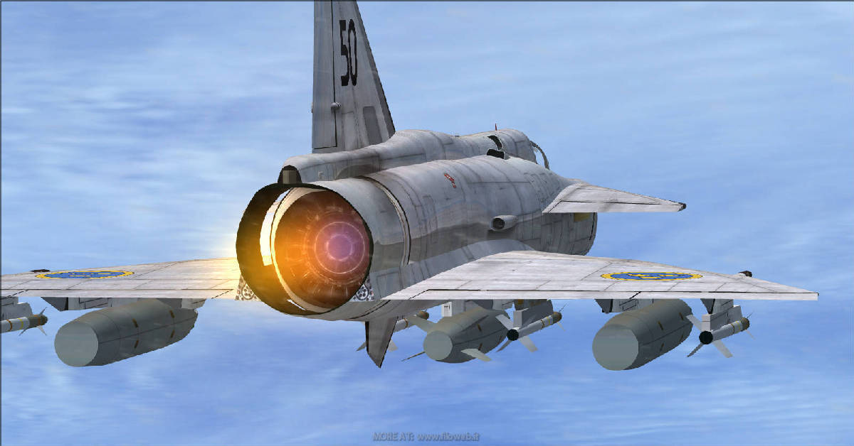 Filoweb.it aereo: Saab AJ37 Viggen (attacco) SH37 (marittima) SF37 (ricognizione) - Origine: Svezia Motori: 1 turboventola Volvo Aero RM8B con postbruciatore e spinta da 72 a 125 kN Prestazioni: Velocità massima 2,1 Ma (2231 km/h in quota). Velocità di salita 203 m/s. Autonomia 2000 km. Tangenza 18000 m Armamento: Bombe caduta libera: Mk 82. Missili aria superficie: AGM-65 Maverick. Missili anti