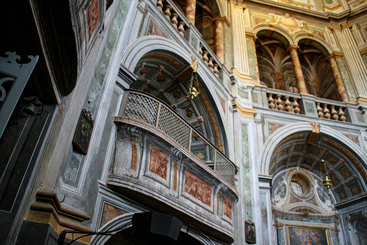 Al suo interno, nella cappella a sinistra dell'altare maggiore, è collocato il monumento funebre realizzato interno al 1592 dallo scultore Giovan Battista Della Porta di Vespasiano I°. La statua in bronzo del duca campeggia sulla tomba realizzata in marmi policromi. Da sottolineare le decorazioni interne settecentesche a trompe-l’oeil che creano uno slancio verso l’altro.